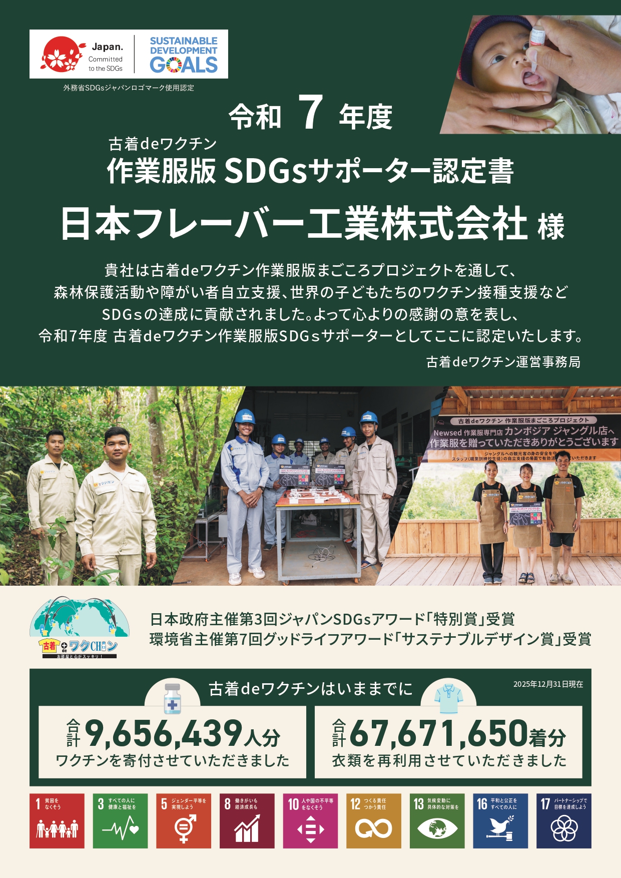 当社では、SDGsの取り組みの一環として「古着deワクチン」に参加いたしました。 不要になった作業服等を寄付する事で、 カンボジアや発展途上国を中心に現地での再利用やポリオワクチンの寄付につながる取り組みで、 今回古着deワクチン作業服版の「SDGsサポーター」に認定されました。 今後も当社は事業活動を通じて社会課題の解決に貢献し、企業としての社会的責任を果たすとともに、 持続可能な社会の実現に向けた取り組みを継続してまいります。
