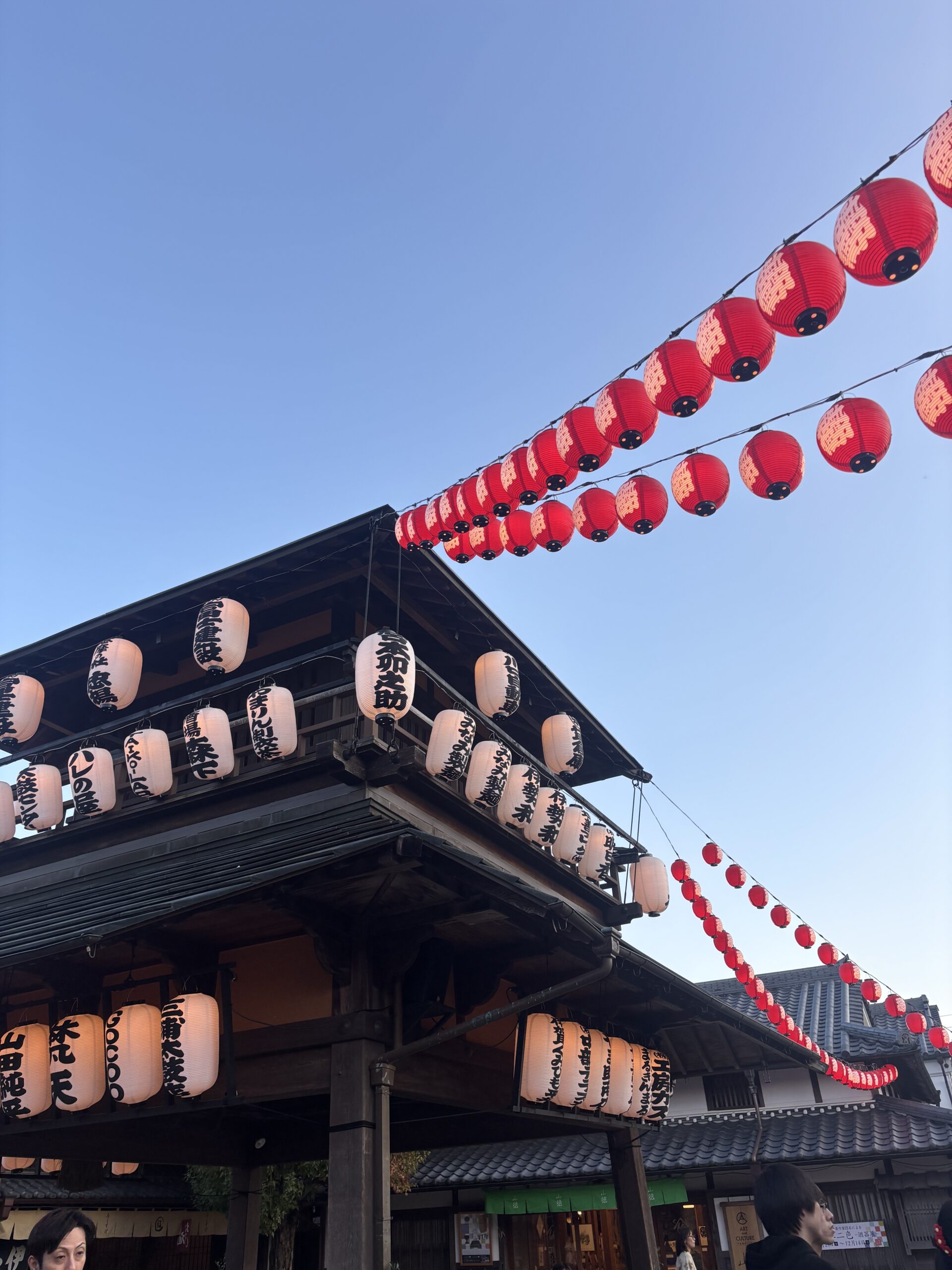 御祈祷後は神宮内やおかげ横丁を散策したりして、各自自由に過ごしました!                          日が暮れて、おかげ横丁の町並みに灯りがともりはじめると幻想的な風景に…♪